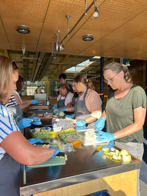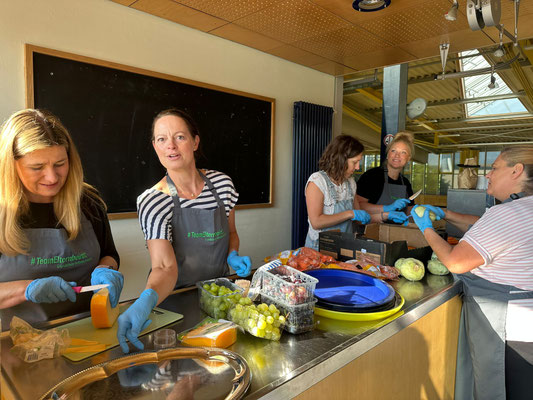 Diverse mundgerecht zerteilte Obstsorten, Gemüsesticks, Laugenstangen, eine frisch gemixte Bananenmilch sowie reichlich Wasser sorgten an diesem heißen Tag für Stärkung und Erfrischung bei den Kindern