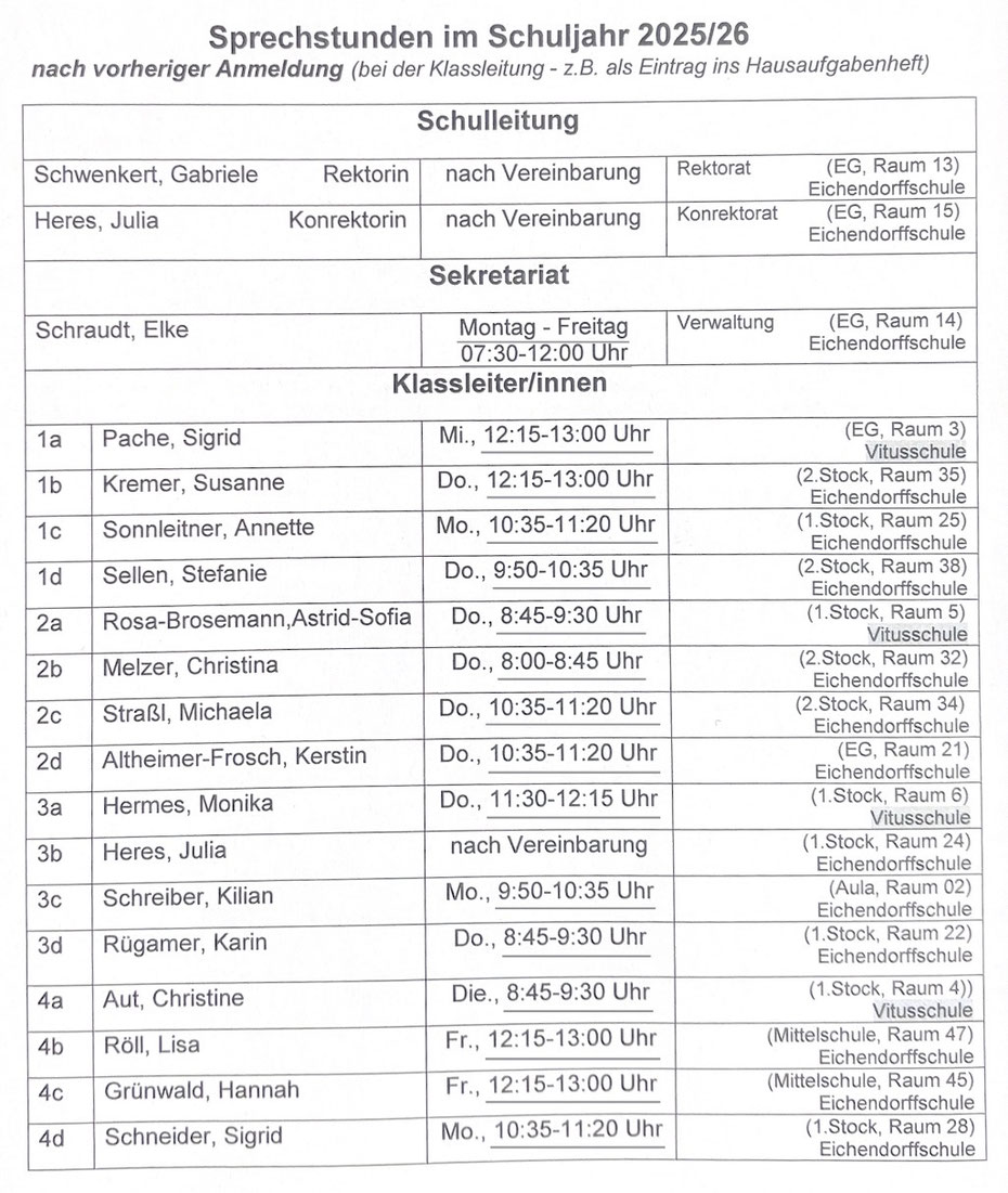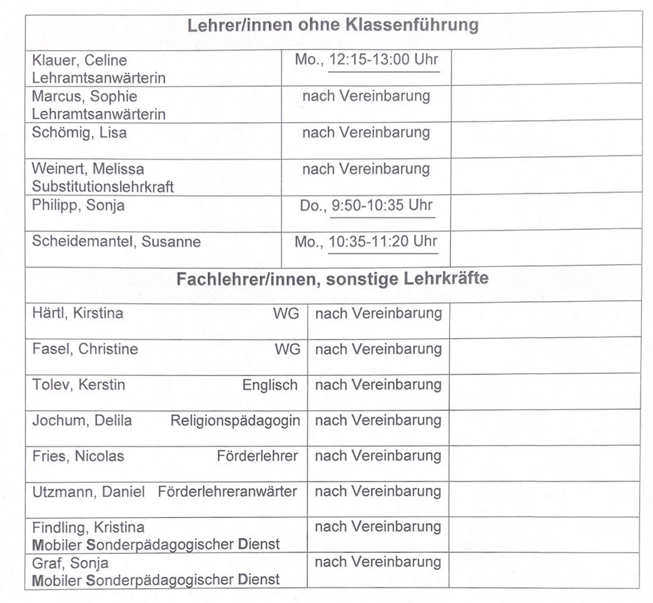 Im Folgenden finden Sie die Sprechstunden der einzelnen Klassenleiterinnen. Alle weiteren Lehrer ohne Klassenführung / Fachlehrer können nach Vereinbarung gesprochen werden!